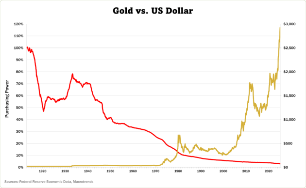 Because the first chart above shows the dollar and reveals the dollar’s devastating loss of purchasing power over the last 100 years. And the second chart shows the stellar rise of the price of gold over the same period.