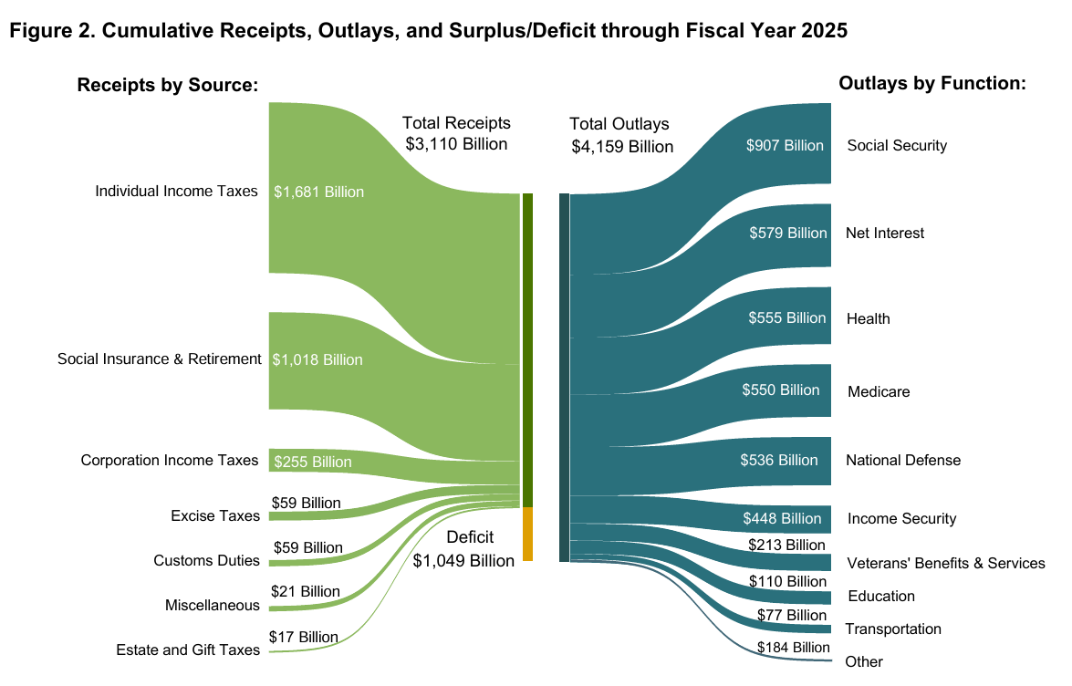 According to the US Treasury, total 2025 fiscal year receipts will be around $3.1 trillion… and total outlays will be $4.1 trillion: